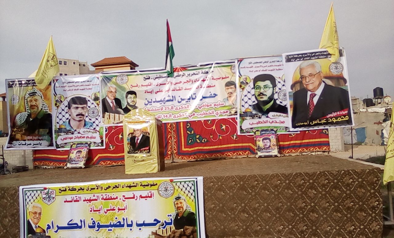 مفوضية الإعلام- رفح: وسط حضور جماهيري كبير أحيت حركة التحرير الوطني الفلسطيني فتح إقليم رفح وتحت رعاية مفوضية الشهداء والجرحى والأسرى بالهيئة القيادية العليا بالمحافظات الجنوبية، ذكرى استشهاد قائد كتائب شهداء الأقصى الشهيد مجدي الخطيب وقائد صقور فتح الشهيد سليم موافي .