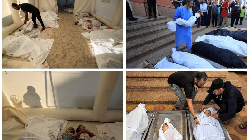 يحاول رجل عبثا حبس دموعه وهو يحمل جثمانا صغيرا في كفن أبيض، وقربه تبكي نساء أطفالهن بينما يؤدي رجال صلاة الجنازة ... في مستشفى ناصر جنوب قطاع غزة.