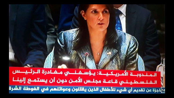 مفوضية الإعلام- نيويورك: اعربت مندوبة الولايات المتحدة الأمريكية نيكي عن أسفها من مغادرة الرئيس محمود عباس قاعة مجلس الأمن، قبل مباشرتها كلمتها.